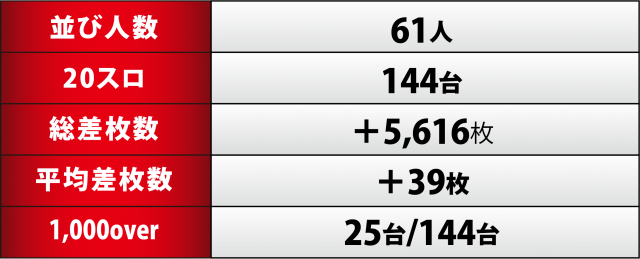 この日、21.74スロ全240台の総計は+5,616枚と、初陣を勝利によるスタートをきることができた。