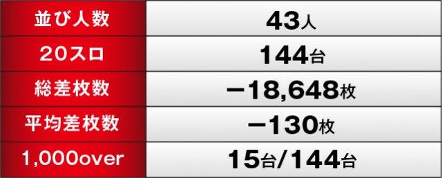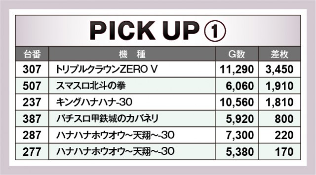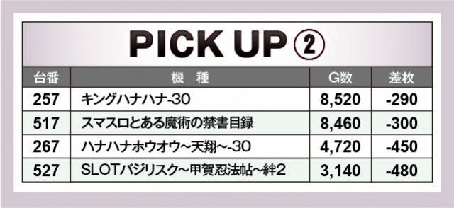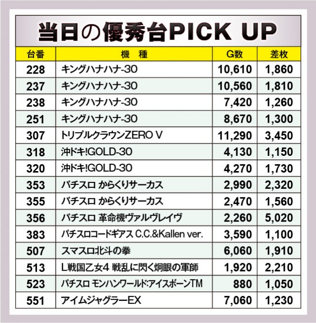 上表を確認してもらえれば分かるように、当日は特定末尾の台がポテンシャルを秘めていた。消化されたゲーム数からハッキリと窺えるため、この法則性に気づいたファンは力強くレバーを叩いていたのかもしれない。全台がプラス差枚を築いたわけではないが、可能性を見出すことができたため、次回以降は強く意識して見るといいだろう。