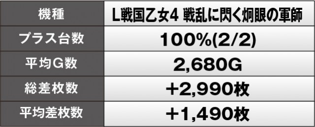『L戦国乙女4 戦乱に閃く炯眼の軍師』は設置されている2台ともにプラス差枚を達成しており、こちらも館内の熱気と活気に貢献した機種の1つだ。平均差枚数も4桁を記録しているため、しっかりと出玉を伸ばしていた様子が窺える。より多くの回転数が伴えば、数字も大きくなることが予想されるため、次回以降はファン諸氏の奮起にも期待したい。