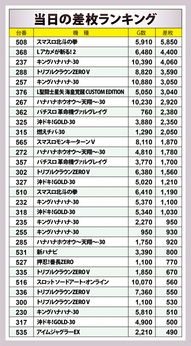 差枚数が多い順では『スマスロ北斗の拳』に+5,900枚弱、『キングハナハナ-30』に+4,100枚弱、『トリプルクラウンZERO V』に+3,600枚弱と、それぞれがチャンスを活かし大量獲得が生じた。