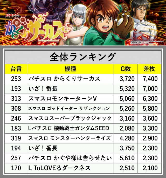 厳選された取材対象機種をはじめ、その他スロット全体から好記録が飛び出した!プレイヤーが楽しんだ1日を下記データにて振り返ってみて欲しい。