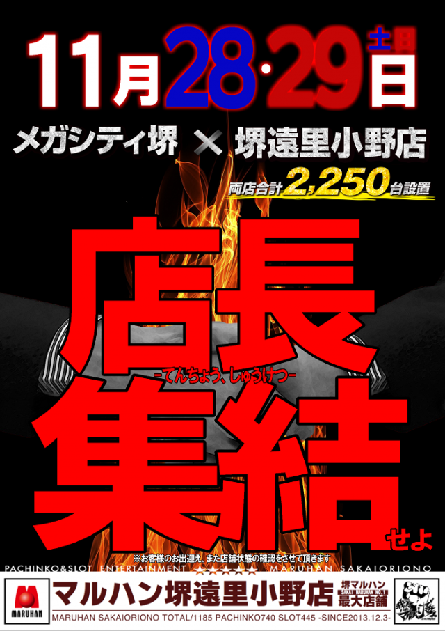 11月29日(日)堺遠里小野店へ店長集結!朝10時オープン!