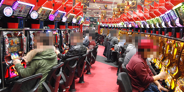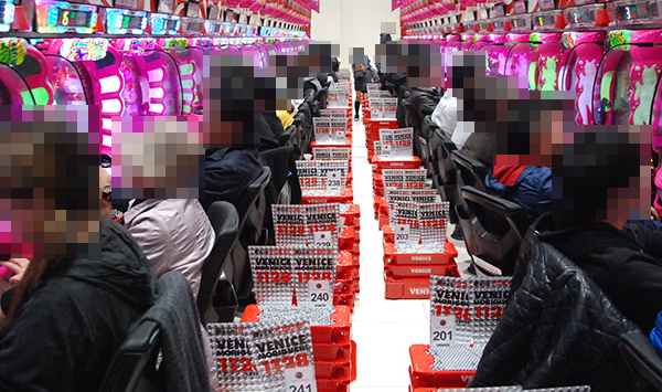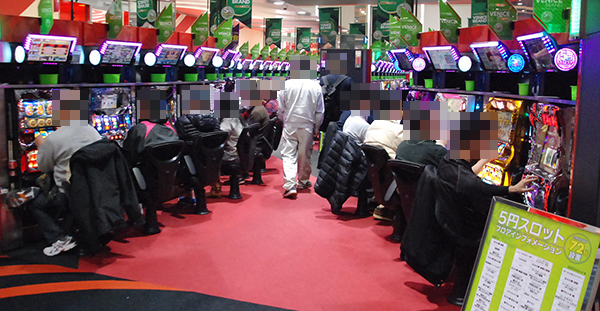 5円パチスロと1円パチンコの支持も厚く、空き台はほとんど見当たらない。