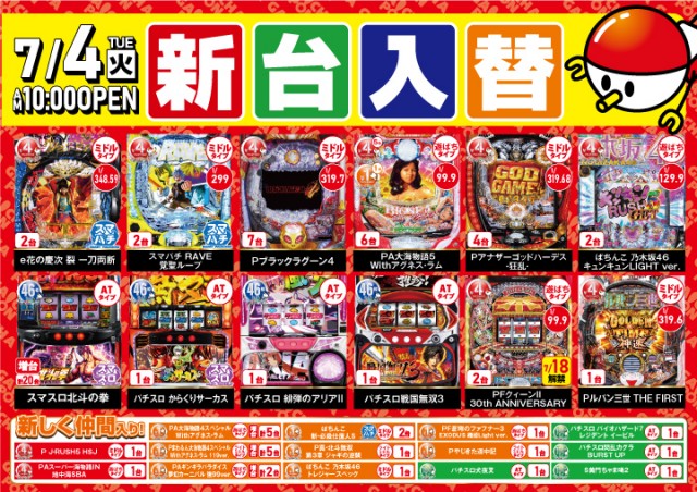 新台入替完了!7月4日10時開店♪ご来店お待ちしております♪