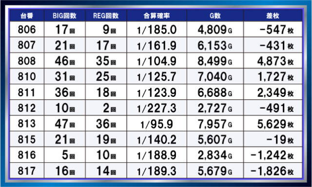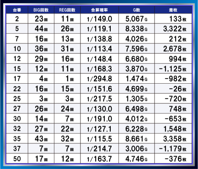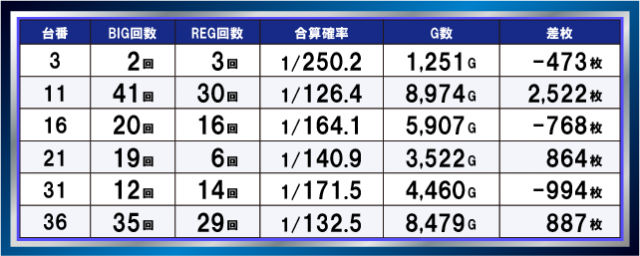 差枚+3300枚を筆頭に、+2600枚の台もあり、終日じっくりと粘られる姿が多く見られた。
