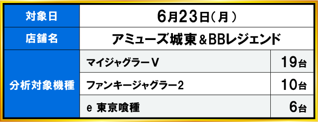 この日は『マイジャグラーⅤ』が好調。+5200枚の台が登場し、シリーズならではの勢いが目立った。