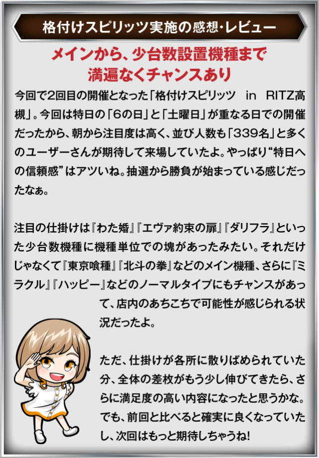 8月16日(土) RITZ高槻店にて、DMMぱちタウンの「格付けスピリッツ」を実施。
