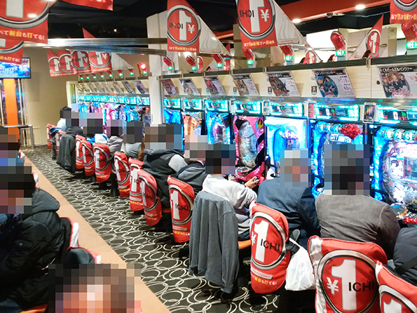 1円パチンコも大盛況で、空き台を探す方が難しいほどの盛り上がりをみせていた。