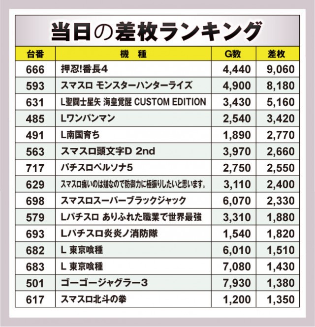 さて、初実施となった今回のランキングを見てみるとしよう。差枚数トップとなったのは『押忍!番長4』。666番台からお見事+9,060枚という万枚一歩手前の差枚数が飛び出した。