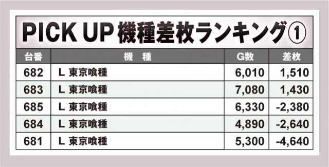 以下も人気機種がランクインしている形となったわけだが、新機種の『L 東京喰種』に関しては682番台と683番台がプラス差枚数となった。