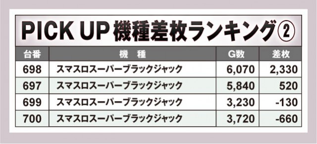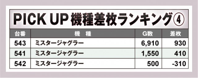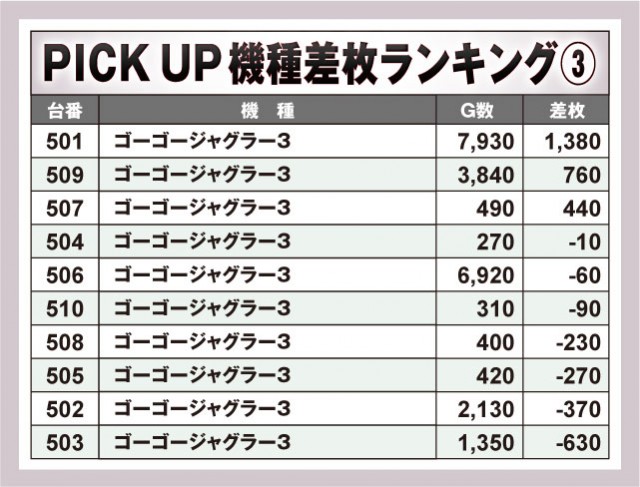 コチラは気になる機種をピックアップしてお届けするピックアップのコーナー。今回は4機種の全台データを記載している。どの台がどれくらい稼働してどれくらいの差枚数だったのか確認しておこう。