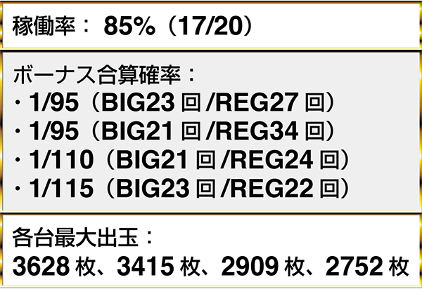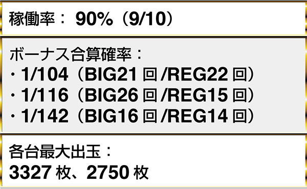 ・『マイジャグラーⅢ』にボーナス合算確率1/120以下が4台。最大獲得出玉は3628枚