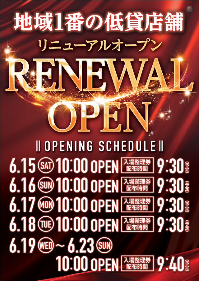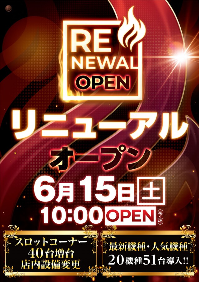 明日6/15(土)リニューアルオープン!スロット増台!予定