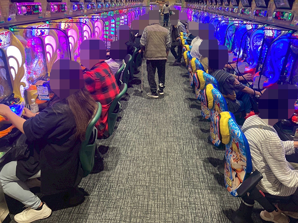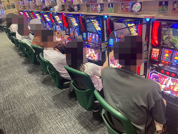 取材時は多くのプレイヤーが来店。パチンコ・パチスロともに、様々な機種が支持を得ていた。