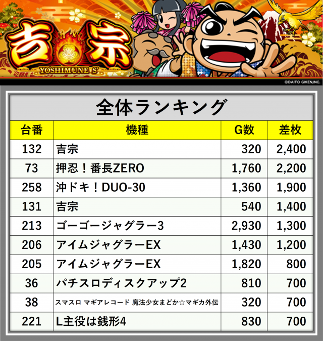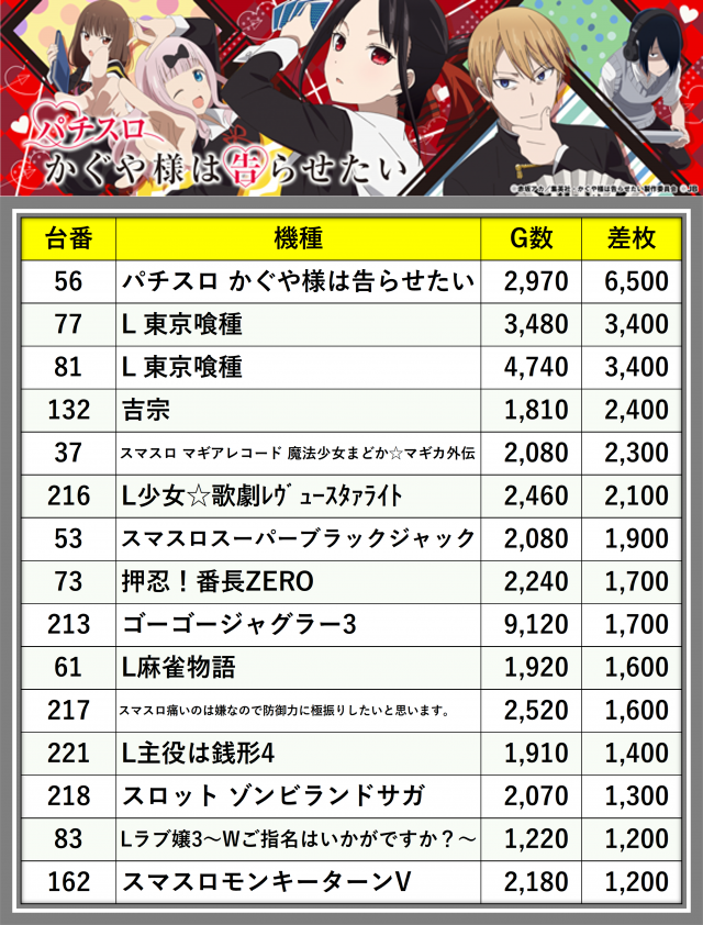 ※差枚数順に掲載しています