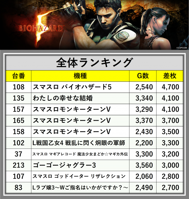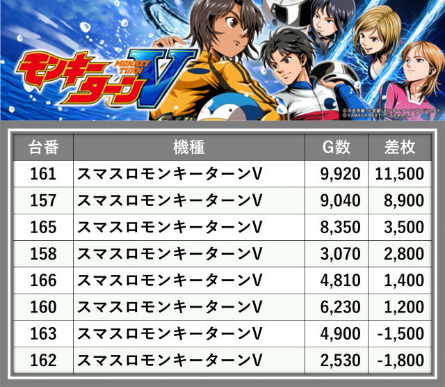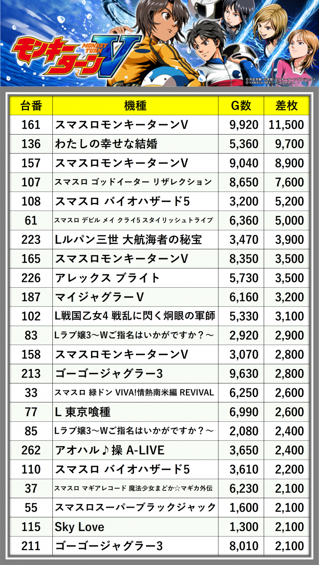 厳選された取材対象機種をはじめ、その他スロット全体から好記録が飛び出した!プレイヤーが楽しんだ1日を下記データにて振り返ってみて欲しい。