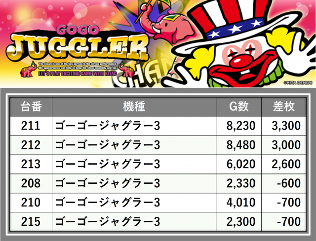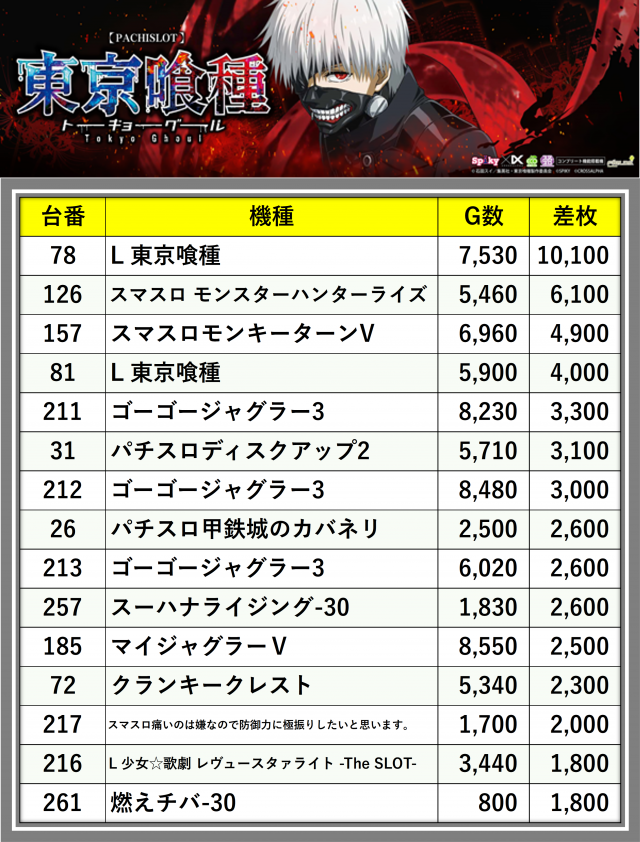 厳選された取材対象機種をはじめ、その他スロット全体から好記録が飛び出した!プレイヤーが楽しんだ1日を下記データにて振り返ってみて欲しい。