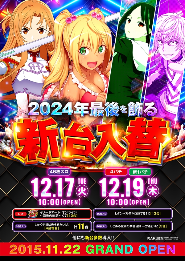 12月19日全館10時開店!今週は新台入替を2回実施!