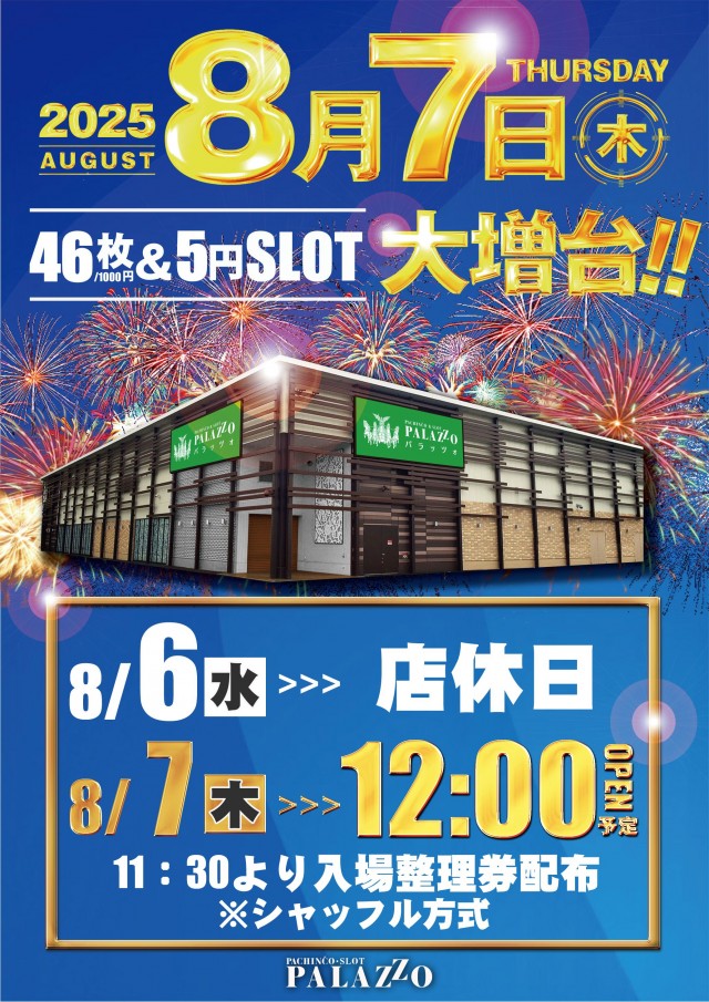 8/7(木)12時開店! 46枚&5円スロット大増台!