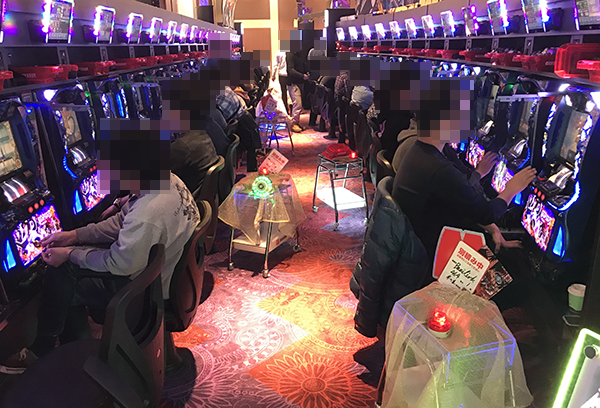 開店直後の20円パチスロでは、新台の「押忍!番長3」や「バジリスク~甲賀忍法帖~絆」など、多くの機種が満席。