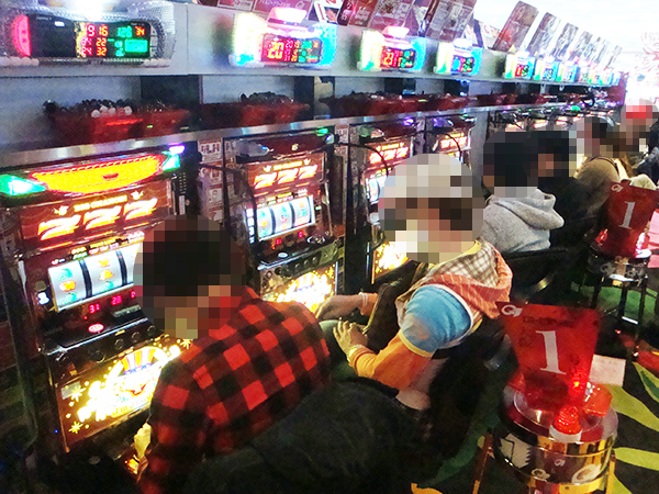 「アイムジャグラーEX-AE」などジャグラーシリーズや「3×3EYES ~聖魔覚醒~」などボーナスタイプ、5円パチスロもにぎやかな状況。満足気な表情でレバーを叩くプレイヤーも多数確認している。