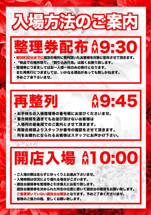 朝9時45分までに指定の場所に整列頂いたお客様を対象に配布させていただきます。 |