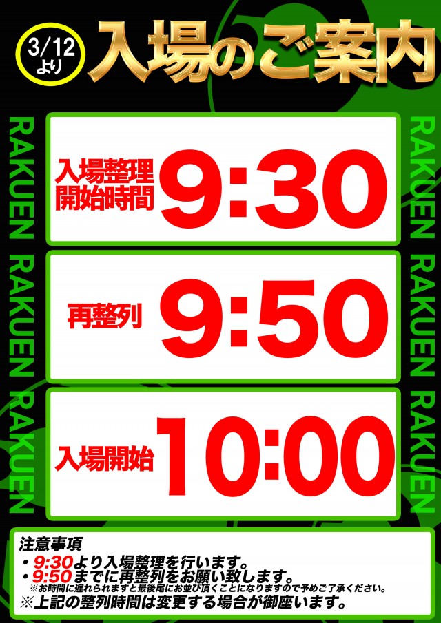 新台入替等で時間の変更が御座います。ご来店される前に各種ホームページをご参考下さい。 |