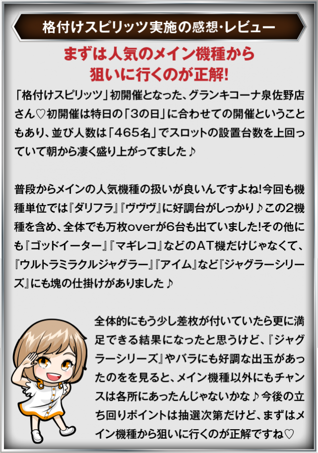 8月23日(土) グランキコーナ泉佐野店にて、DMMぱちタウンの「格付けスピリッツ」を実施。