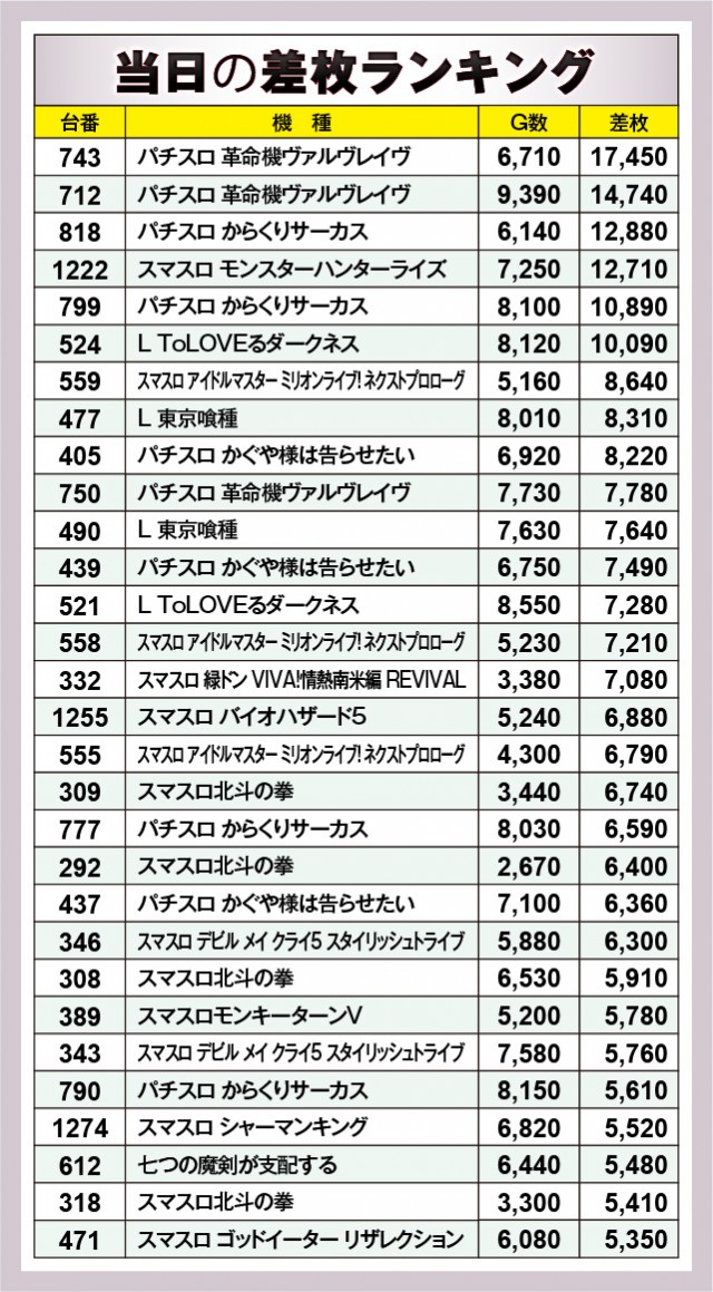 上表はすべて5,000枚OVERの大台突破を果たしており、同店の圧倒的な実力がヒシヒシと伝わってくるばかり。その中で『パチスロ 革命機ヴァルヴレイヴ』『パチスロ からくりサーカス』『スマスロ モンスターハンターライズ』『L ToLOVEるダークネス』から合計6台の万枚OVERが発生。凄まじい熱気が店内を包み込んでおり、7~8,000枚OVER台も多数見られる。また回転数に着目しても終日を通して打ち込まれており、ファンが大きな手応えを感じていたのは間違いない。