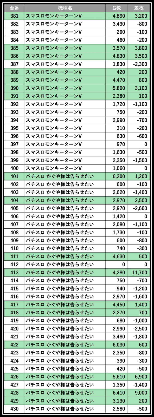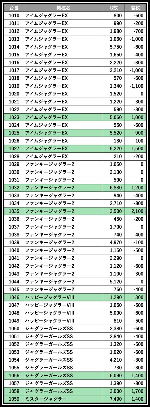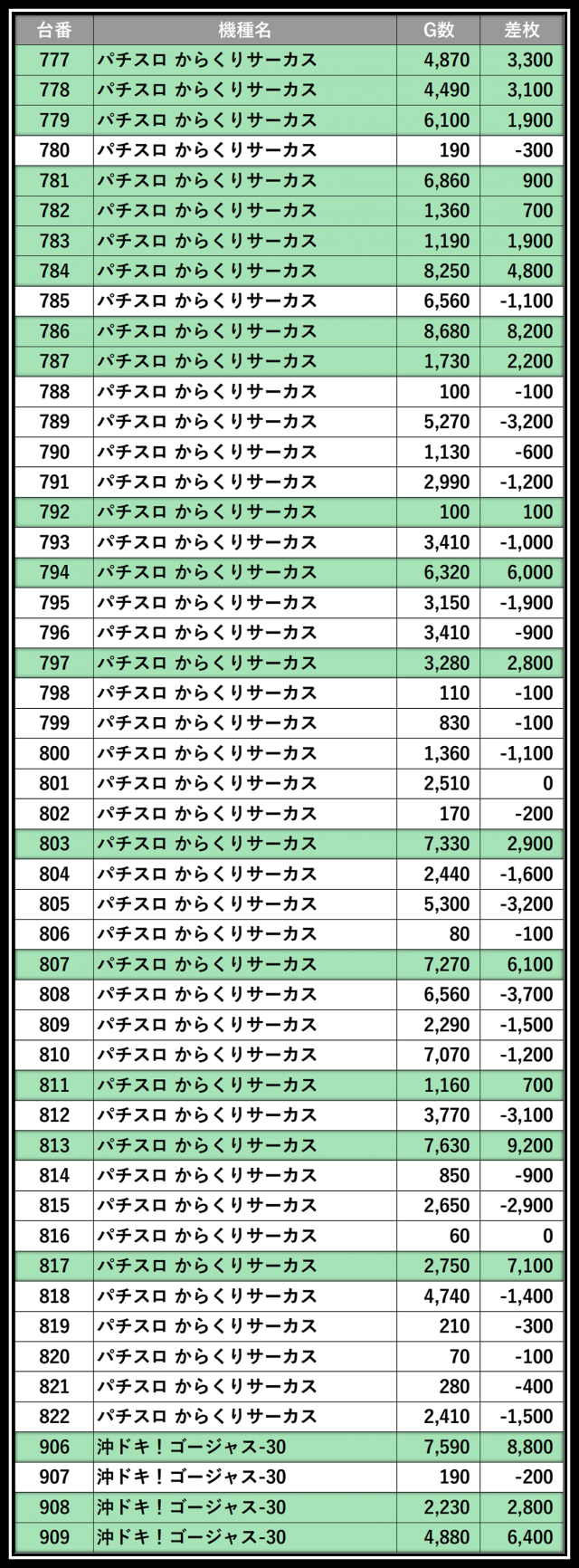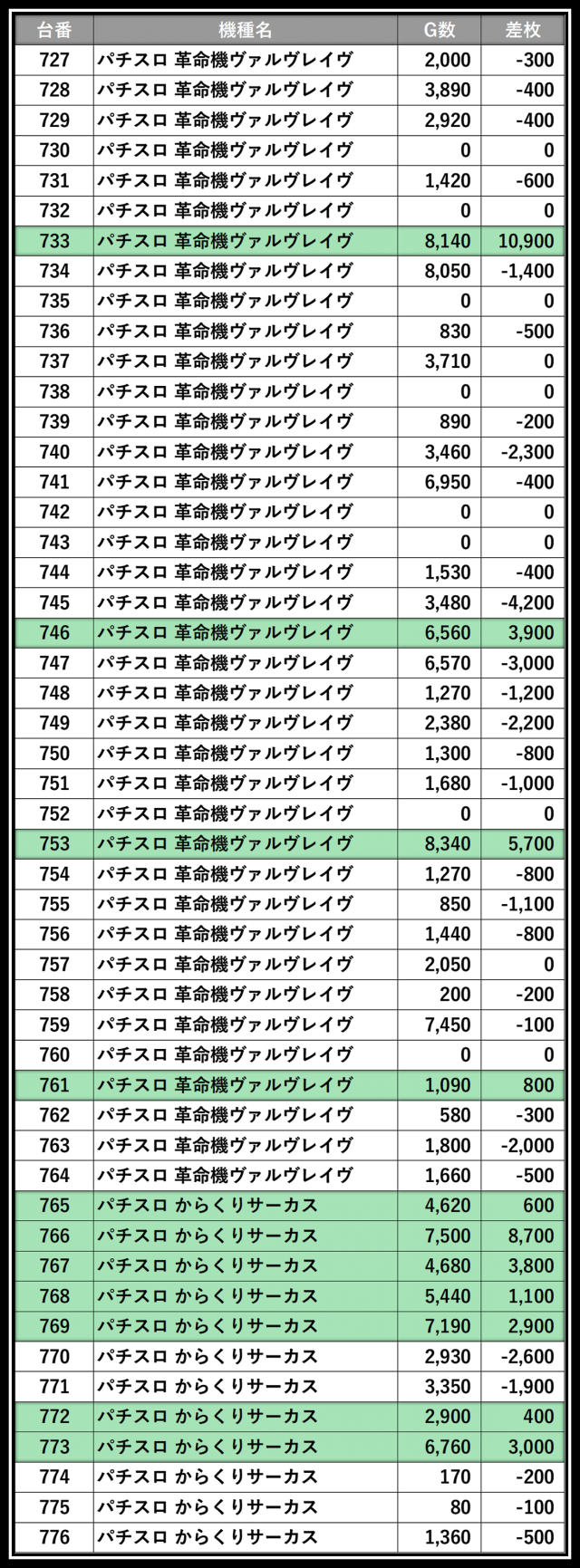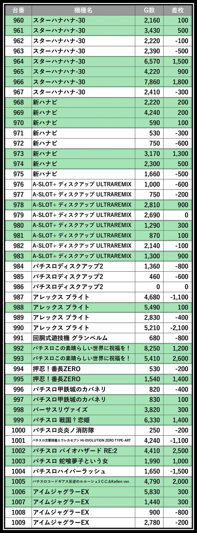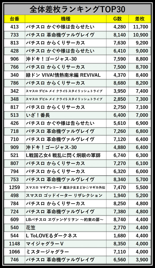 ※差枚数順に掲載しています