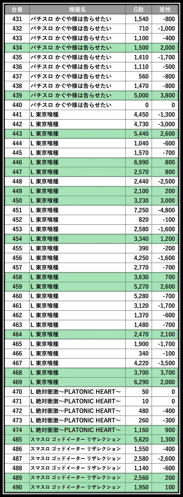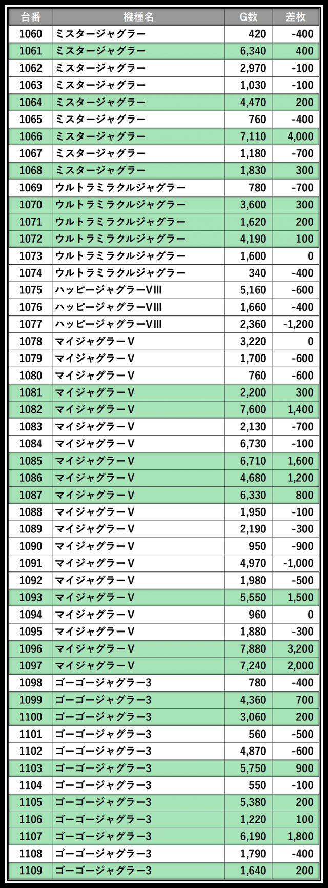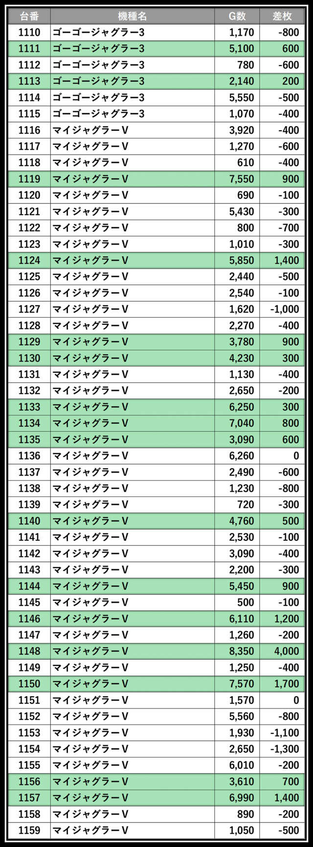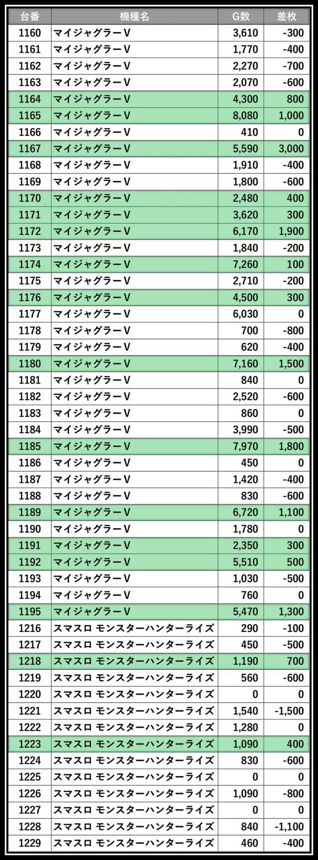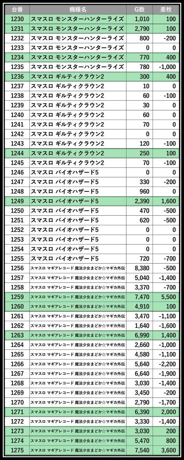 ※差枚数順に掲載しています