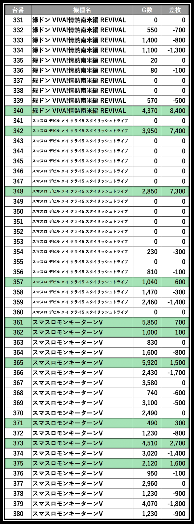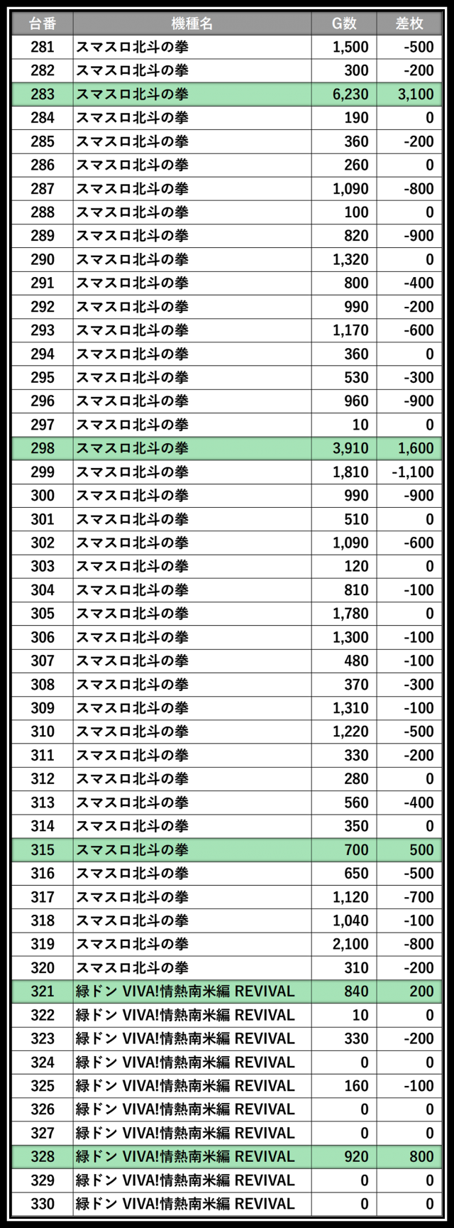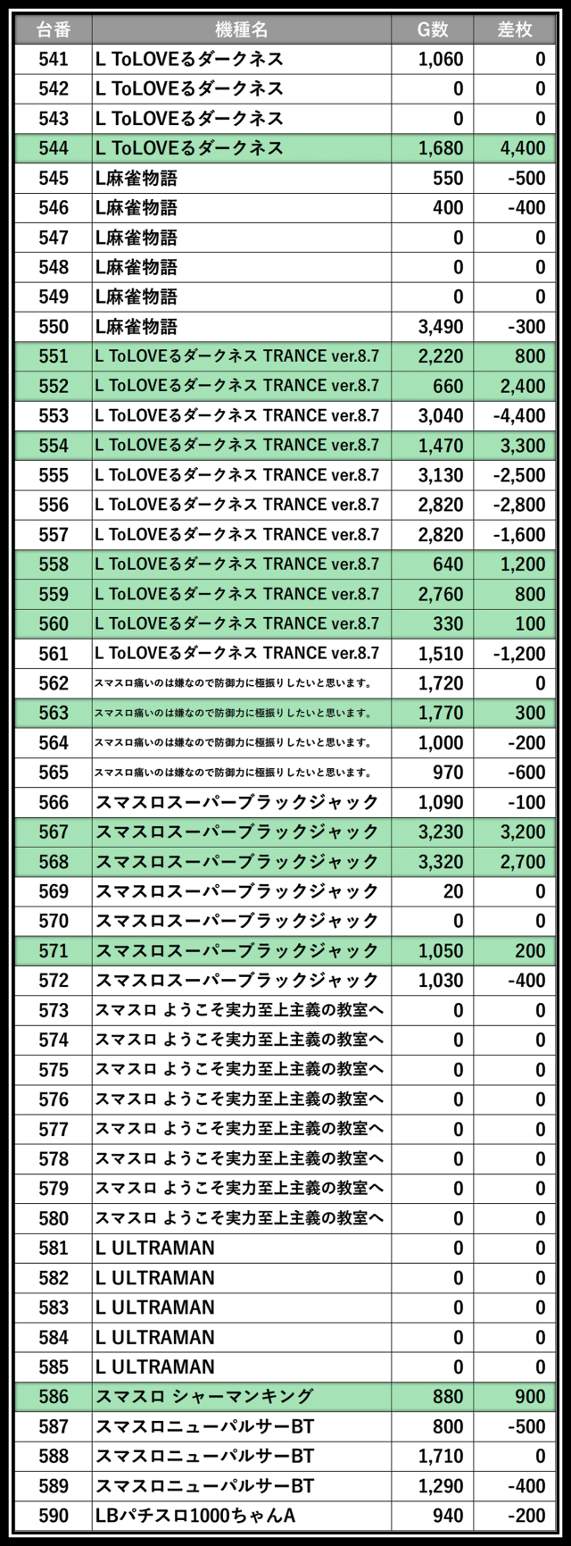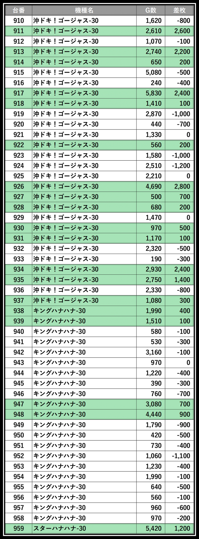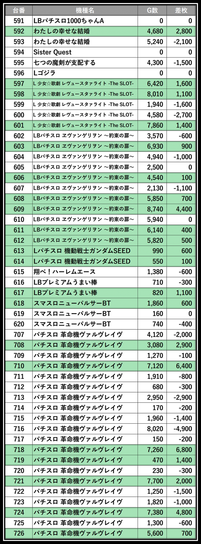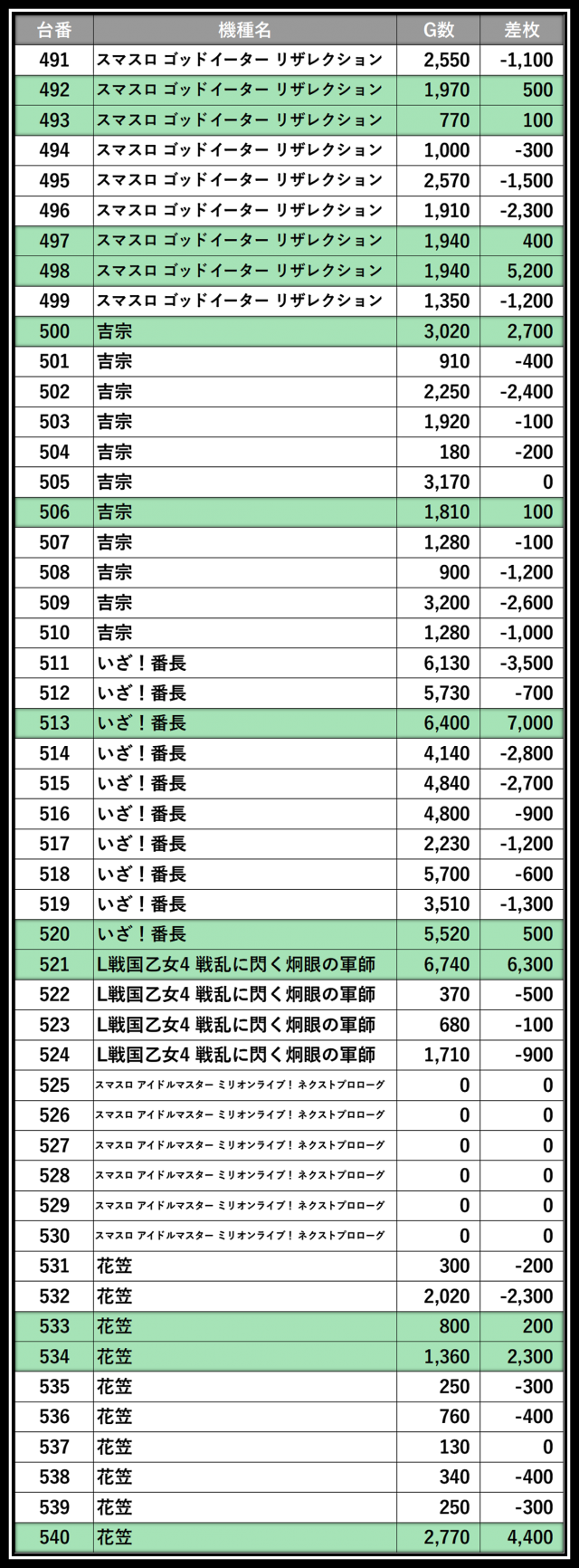 ※差枚数順に掲載しています