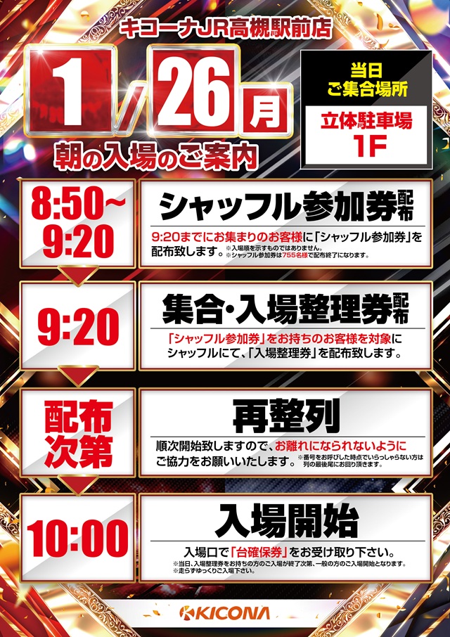 1月26日(月)8時50分~9時20分→シャッフル参加券・9時20分→入場整理券配布予定 |