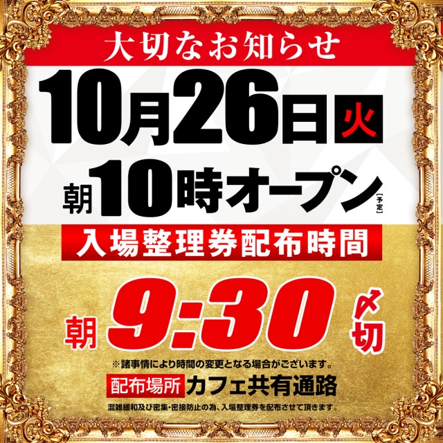 ① 抽選時間 9時30分締切・大通り側共有通路にて実施致します。② 新台入替日は検査終了次第、開店させて頂きます。 |