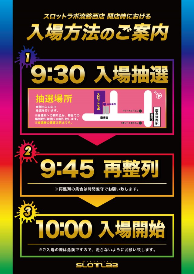 午前9時30分より東側入口にて入場抽選を行います。抽選後の再整列は午前9時50分です。※予告なく変更する場合がございます。予めご了承下さい。 |