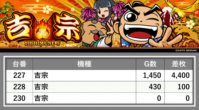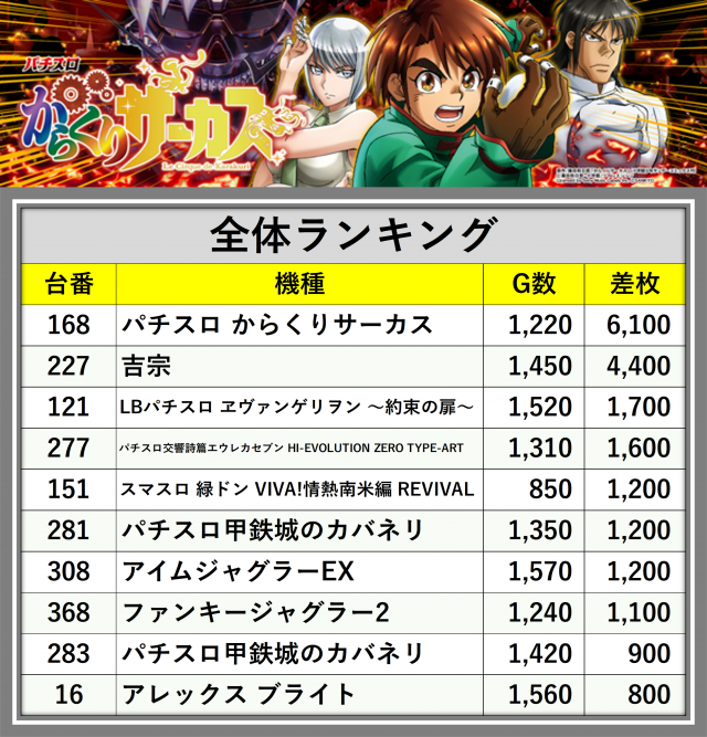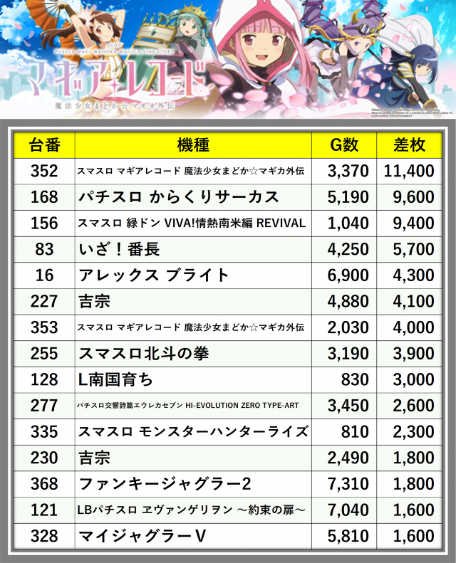 厳選された取材対象機種をはじめ、その他スロット全体から好記録が飛び出した!プレイヤーが楽しんだ1日を下記データにて振り返ってみて欲しい。