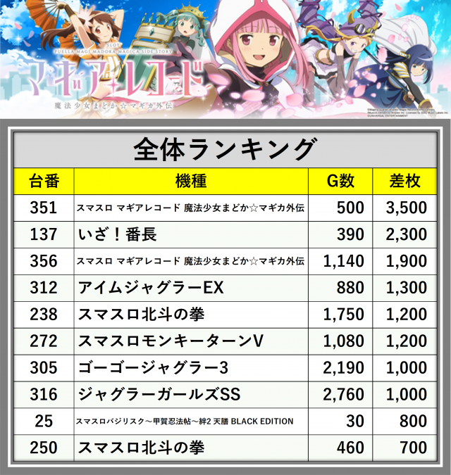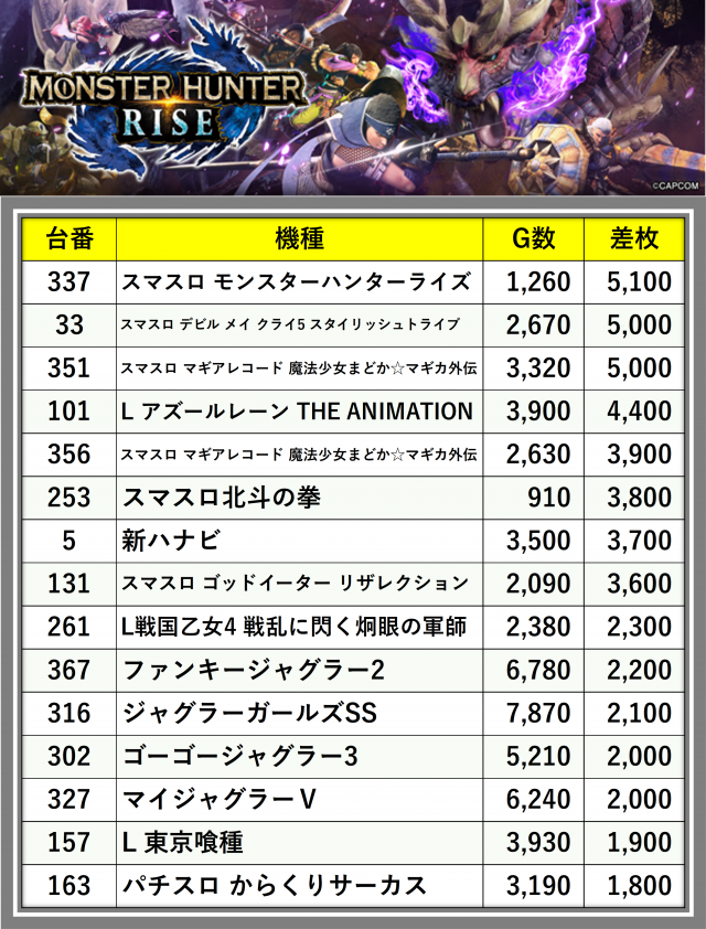 厳選された取材対象機種をはじめ、その他スロット全体から好記録が飛び出した!プレイヤーが楽しんだ1日を下記データにて振り返ってみて欲しい。