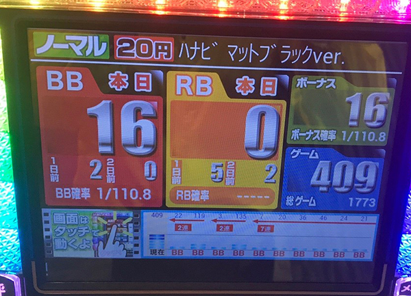 4台中3台が稼働していたことにくわえて、ボーナス合算確率が1/120以上となっているデータも確認した。