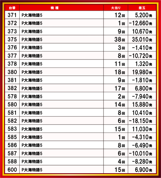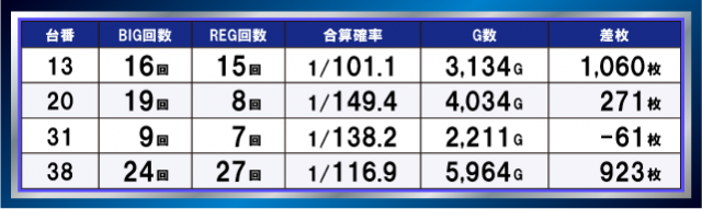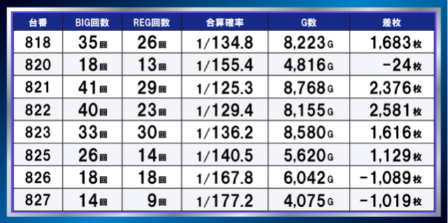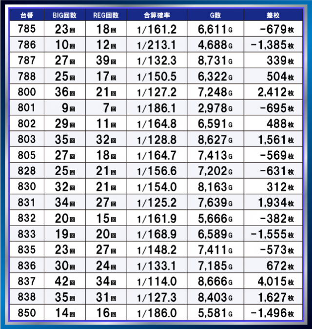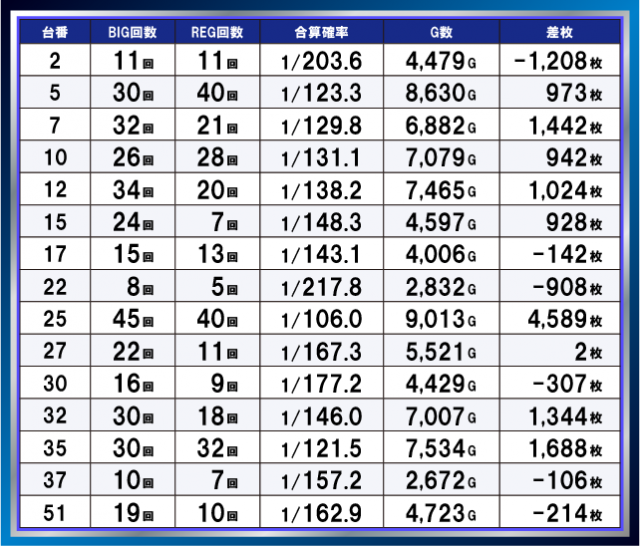 差枚+4500枚超の台も見られ、合成確率・通常ゲーム数ともに高水準の台が複数確認でき、環境の良さがうかがえる。