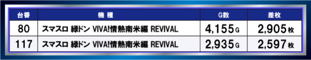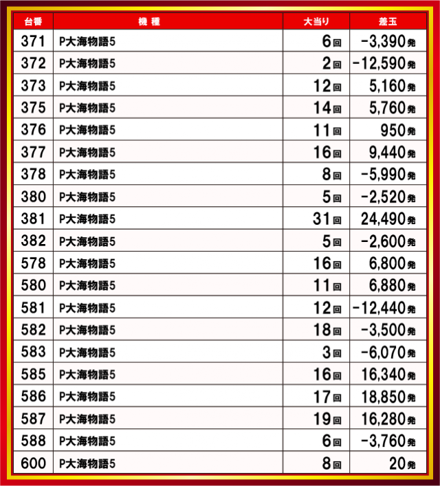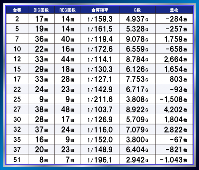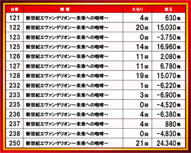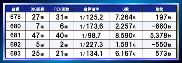 その他の台では突出した爆発は見られなかったものの、粘りのある打ち込みが多く、安定した遊技状況がうかがえる結果に。