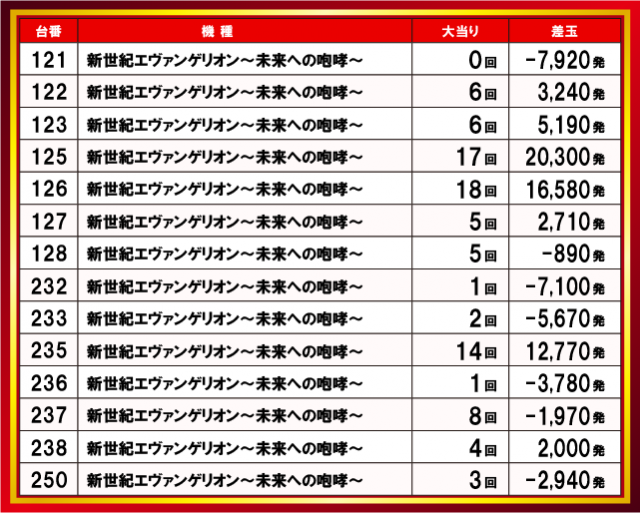 この日のパチンコでは『新世紀エヴァンゲリオン~未来への咆哮~』が目を引く結果に。