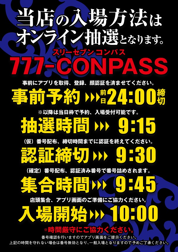 『777CON-PASS』によるオンライン抽選を利用しております。詳細につきましてはアプリにてご確認ください。 |