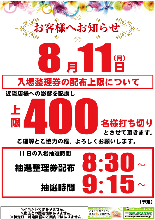 抽選参加券配布 9:10~ 抽選開始時刻 9:30~ |
