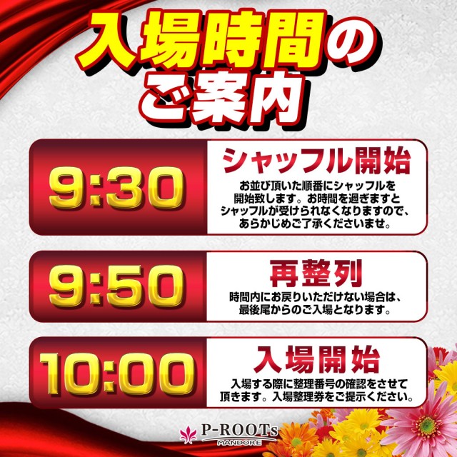 AM9:30 第1駐車場側入口にて シャッフル抽選開始 (整理券番号確定) AM9:50 入場整理券番号順 再整列 AM10:00 入場開始 となります。 |