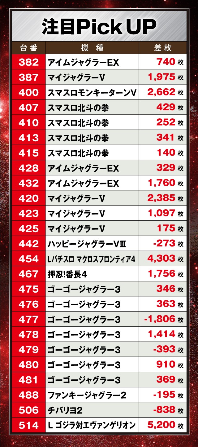 そのほかにも『L ゴジラ対エヴァンゲリオン』は+5,200枚、『Lパチスロ マクロスフロンティア4』は+4,303枚と華麗なパフォーマンスを披露していた。