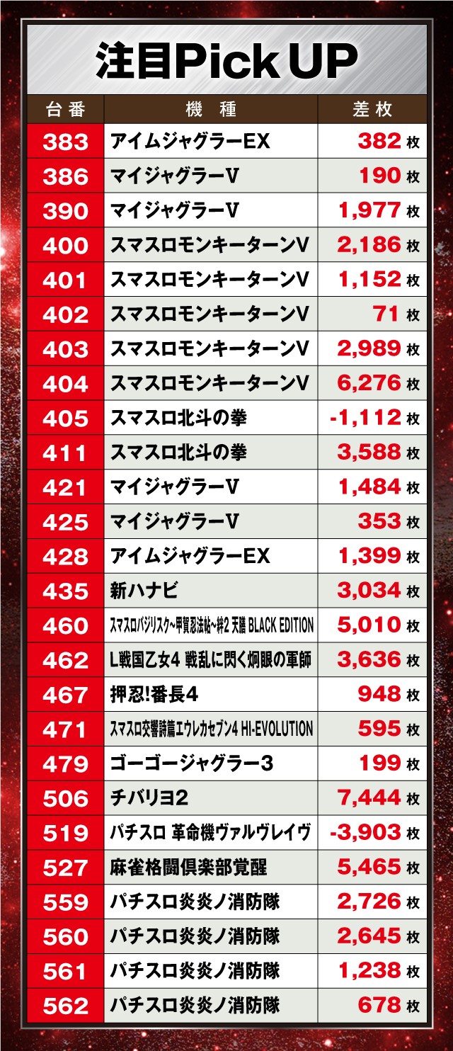 まずは全台系の好調台を2機種確認。『スマスロモンキーターンV』は平均+2,535枚、『パチスロ炎炎ノ消防隊』は平均+1,822枚と、それぞれ素晴らしい結果を残している!