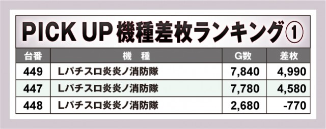 今回のピックアップは『Lパチスロ炎炎ノ消防隊』だ。今回のランキングでは5番手、6番手の差枚数なのだが、449番台と447番台は5000枚に迫る差枚数となった。