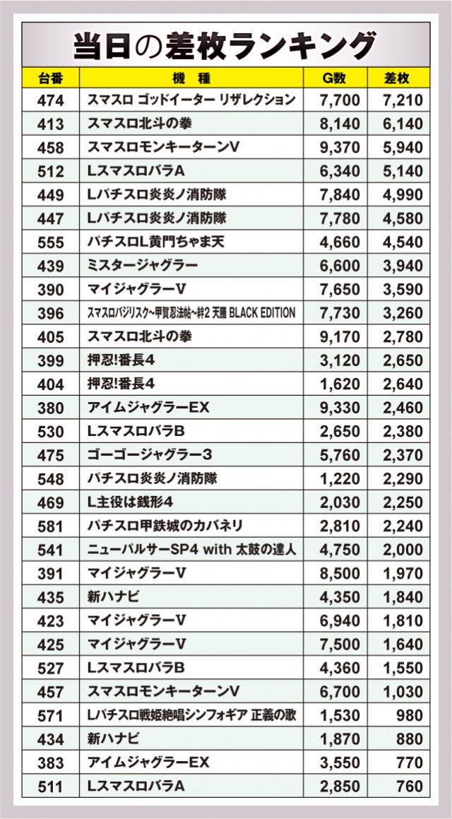 その他、気になるのはやはり「ジャグラーシリーズ」だろうか。『ミスタージャグラー』の439番台と『マイジャグラーⅤ』の390番台も申し分ない差枚数が出ている。ジャグラーも侮れない!