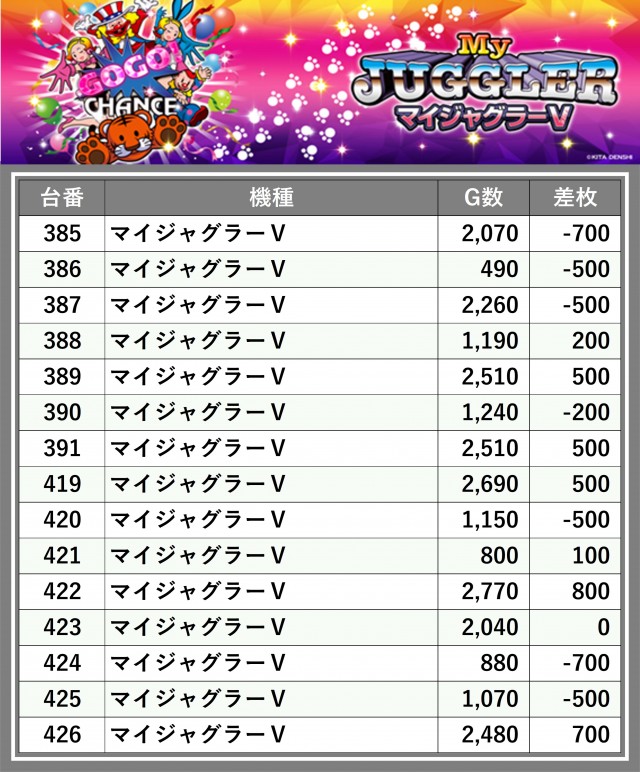 厳選された取材対象機種をはじめ、その他スロット全体から好記録が飛び出した!プレイヤーが楽しんだ1日を下記データにて振り返ってみて欲しい。
