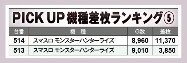 『Lパチスロ炎炎ノ消防隊』『Lバンドリ!』『スマスロ モンスターハンターライズ』は全台プラス差枚数をマークしており、遊技していたファンの笑顔が眩しかった印象だ。特に『スマスロ モンスターハンターライズ』は万枚OVERを達成しており、大きなインパクトを与えたことだろう。『スマスロ ゴッドイーター リザレクション』『スマスロ北斗の拳』も大きな熱を放ち、優秀機種として存在感を放っていた。